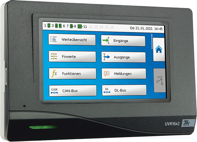Ca UVR16x2K, dar versiunea de platină cu unitate de control de la distanță pentru instalarea în cabinetul de comandă sau instalarea pe cazan. Sistemul de operare, operarea, datele funcționale și transferul de date prin intermediul cardului SD sunt compatibile cu UVR16x2. Legătura dintre placă și unitatea de operare este asigurată de cablul de panglică de 700 mm.